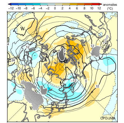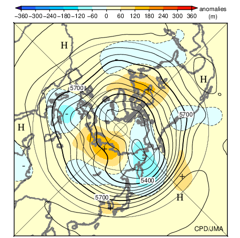 - 500hPa高度では、極渦は東シベリア東部に位置し、カムチャツカ半島付近は顕著な負偏差となった一方、カナダ北東部とリッジが卓越した中央シベリアは顕著な正偏差となった。中緯度は、一部で負偏差となった他は概ね正偏差で、東アジア南部では広い範囲で顕著な正偏差となった。