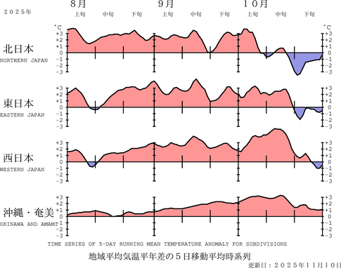 - 天候経過:華北から日本海付近にかけて偏西風が平年より北に偏って流れやすかったため、西日本と沖縄・奄美は暖かい空気に覆われ、月平均気温がかなり高かった。沖縄・奄美では平年差が+2.3℃となり、1946年の統計開始以降、10月として1位の高温となった。北・東・西日本では、中・下旬に低気圧や停滞前線の影響を受けやすかったため、月間日照時間は東日本太平洋側ではかなり少なく、北・東・西日本日本海側と北日本太平洋側では少なかった。また、月降水量は東日本日本海側で多かった。沖縄・奄美では、上・中旬に高気圧に覆われて晴れの日が多かったため、月間日照時間がかなり多かった。また、下旬を中心に熱帯低気圧、湿った空気や停滞前線の影響を受け、月降水量は多かった。