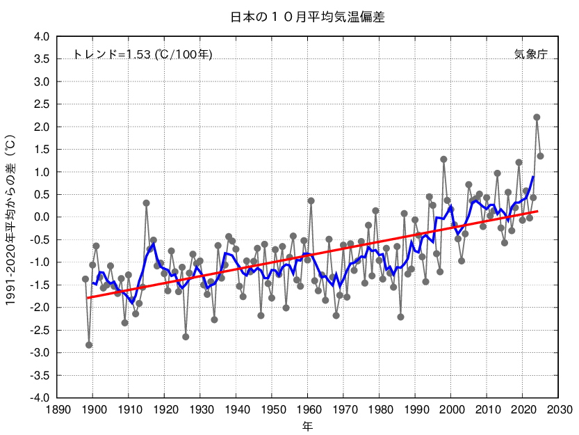 - 平均気温:西日本と沖縄・奄美でかなり高かった。日本の月平均気温偏差は+1.35℃で、1898年の統計開始以降、10月として2番目に高い値となった。10月の日本の平均気温は、上昇傾向が続いており、長期的な上昇率は約1.53℃/100年である。