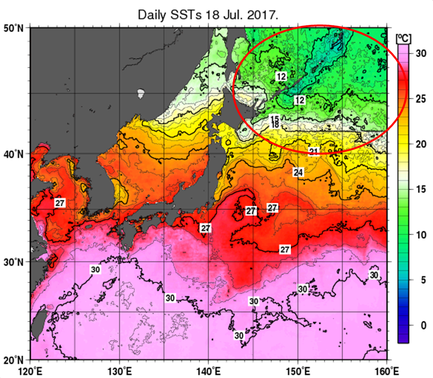 静止気象衛星ひまわりによる海面水温は、北海道東方の海域(図中赤丸の海域)では、夏季に品質が低下します。このため、同資料を用いて作成している「静止気象衛星ひまわりによる海面水温画像」及び「日別海面水温」(日本近海、北西太平洋)が、当海域で不自然な値となる場合があります。当海域では、他の資料も併せて参照するなど、留意してご利用いただきますよう、お願いいたします。