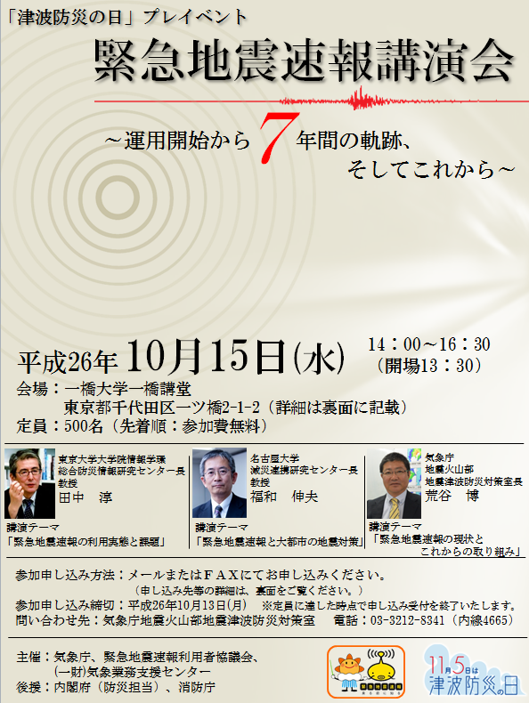 「緊急地震速報講演会 ~運用開始から7年間の軌跡、そしてこれから~」の開催について