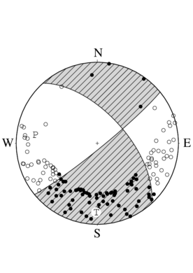 | 走向 | 傾斜 | すべり角 | P軸 | T軸 | N軸 | ||