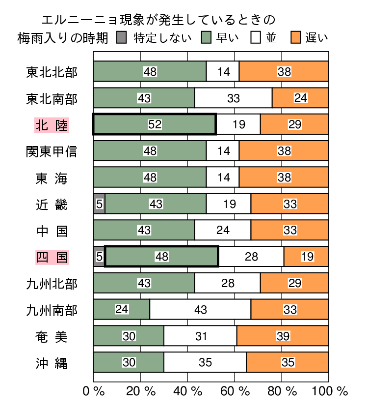 | 図5 エルニーニョ現象発生時の梅雨の時期の天候の特徴(左上:降水量、右上:日照時間) エルニーニョ現象発生時の梅雨入り・明けの時期(左下:梅雨入り、右下:梅雨明け) 統計期間1948年~2021年(梅雨入り・明けの時期は1951~2021年)。棒グラフの数字は出現率を示す。 地域名の赤い帯と棒グラフの太黒枠は統計的に有意な傾向を示す。 |