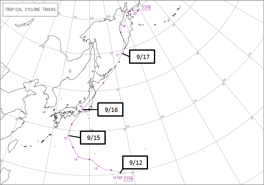 9月13日3時に小笠原諸島近海で発生した台風第18号は発達しながら北上し、東海地方、関東甲信及び東北地方を北東に進みました。