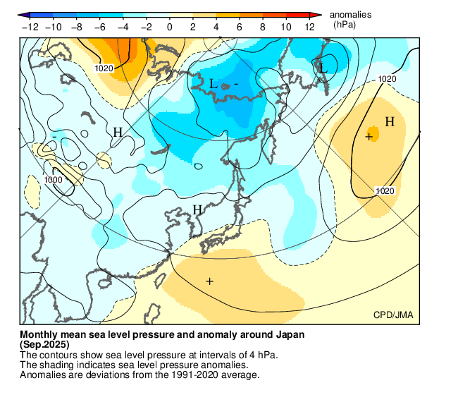 2025年9月平均海面気圧・偏差の分布(単位:hPa) | 2025年9月平均外向き長波放射量の偏差の分布(単位:W/m2) |