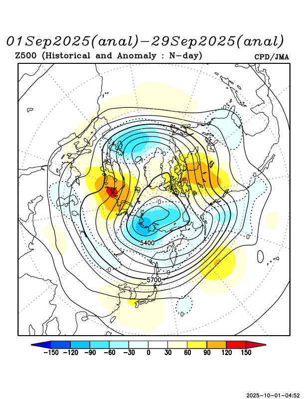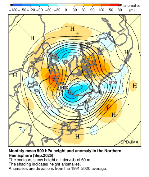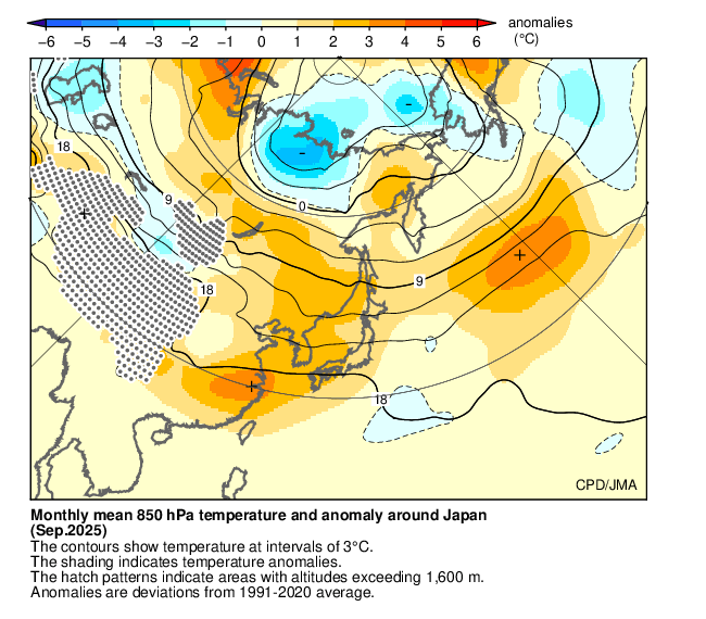 2025年9月平均500hPa高度・偏差の分布(単位:m) | 2025年9月平均850hPa気温・偏差の分布(単位:℃) |