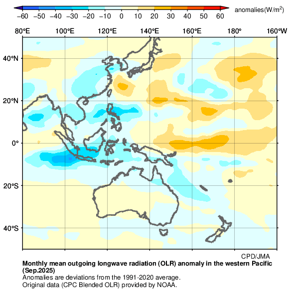 ※ 米国海洋大気庁(NOAA)が作成する外向き長波放射量(OLR)のデータが欠損により利用できない場合には、OLR偏差図は描画されません。 |