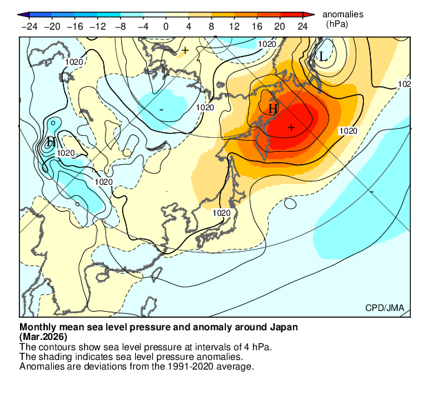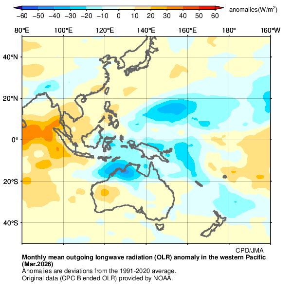 2026年3月平均海面気圧・偏差の分布(単位:hPa) 2026年3月平均外向き長波放射量の偏差の分布(単位:W/m2