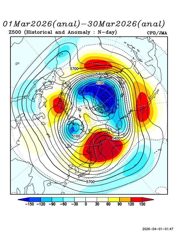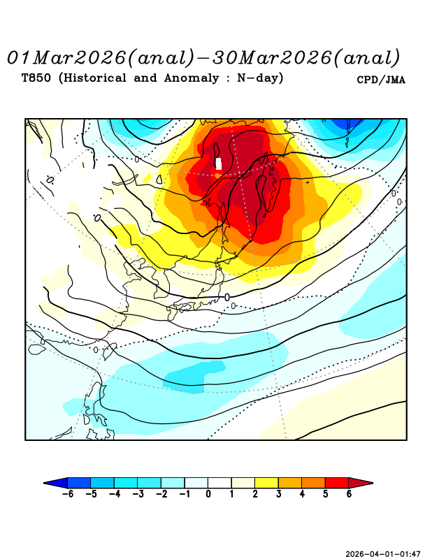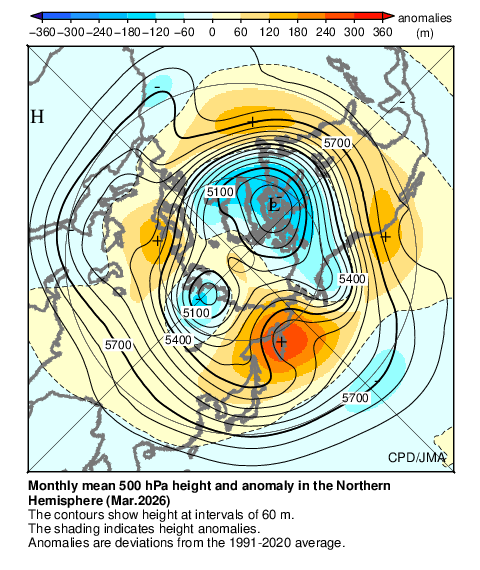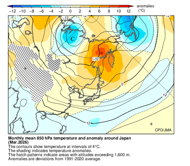 2026年3月平均500hPa高度・偏差の分布(単位:m) 2026年3月平均850hPa気温・偏差の分布(単位:℃)
