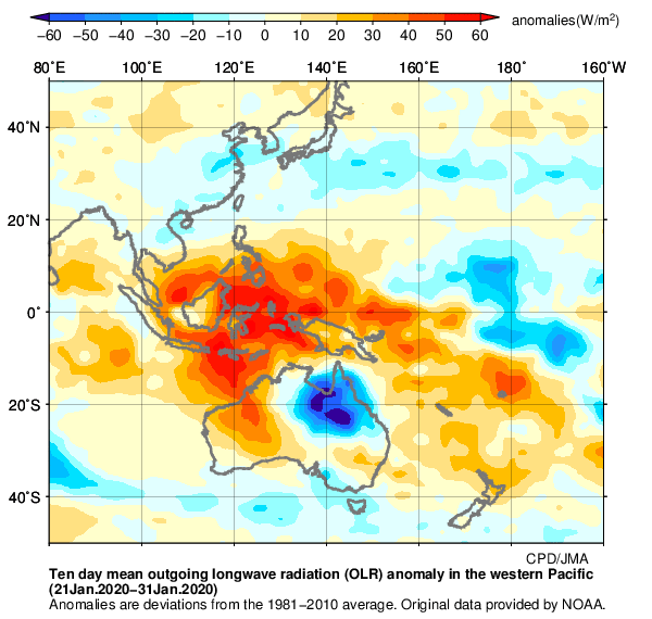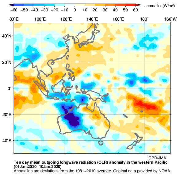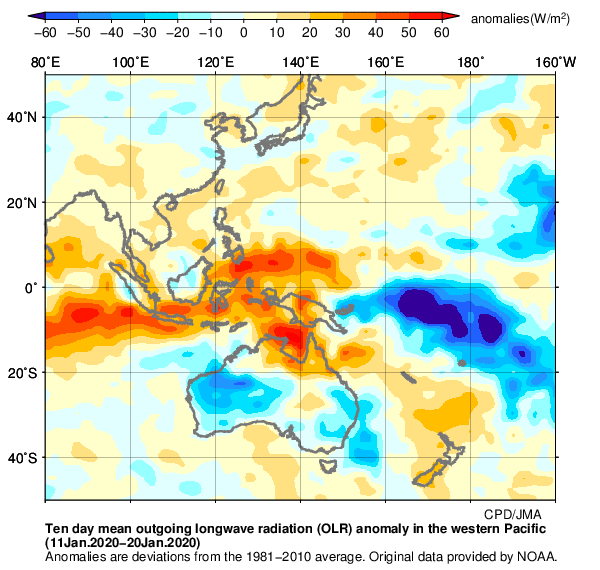 ※ 日本の天候のまとめに掲載している外向き長波放射量(OLR)偏差分布図は、2023年9月以降は米国海洋大気庁(NOAA)気候予測センター(CPC)提供のBlended OLRを、2023年8月までは同センター提供のAVHRR OLRを用いて作成したものです。
