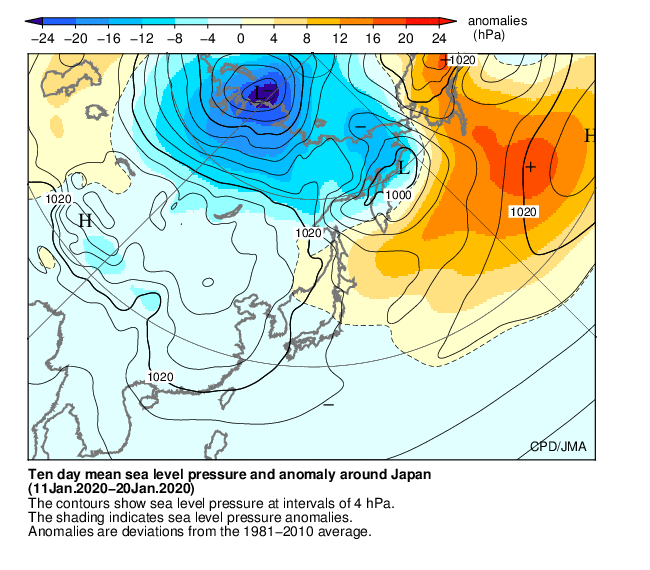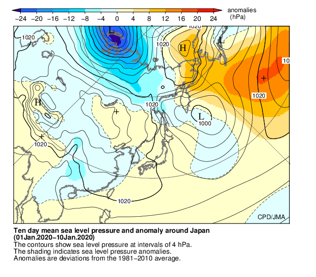 期間の前半は、北日本では冬型の気圧配置となる日が多かったが、東・西日本では高気圧に覆われる日が多かった。期間の後半は、冬型の気圧配置は長続きせず、7日から8日にかけては低気圧が日本海を発達しながら通過したため、東・西日本を中心に大荒れの天気となった。また、南からの暖かく湿った空気が流れ込んだため、東・西日本を中心に気温は平年を大きく上回った。沖縄・奄美では、高気圧に覆われやすく晴れの日が多かったため、日照時間はかなり多くなった。また、降水量はかなり少なく、旬降水量平年比が6%となり、1961年の統計開始以降、1月上旬としては最も少ない値を更新した。