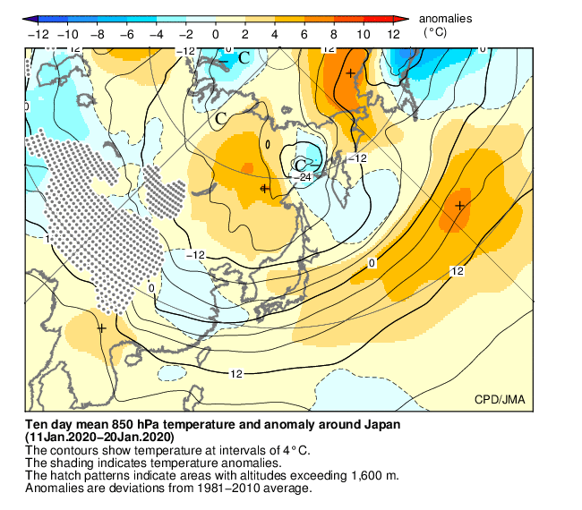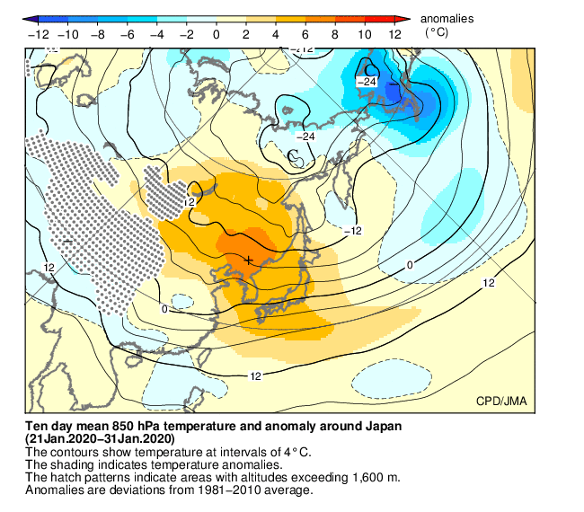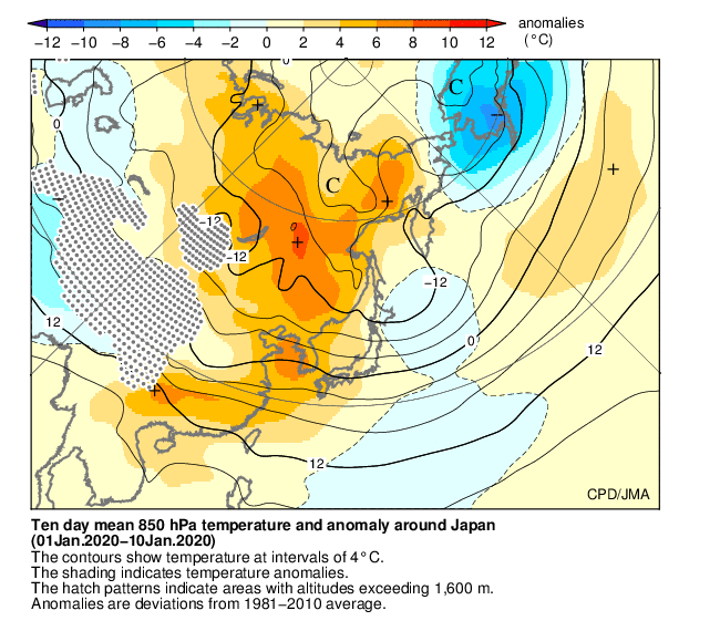 全国的に寒気の南下が弱かったため、気温は東・西日本と沖縄・奄美でかなり高く、北日本では高かった。東・西日本では、1946年の統計開始以降1月として1位の高温となった。