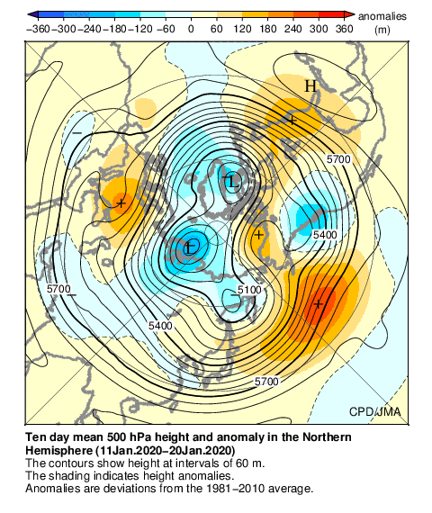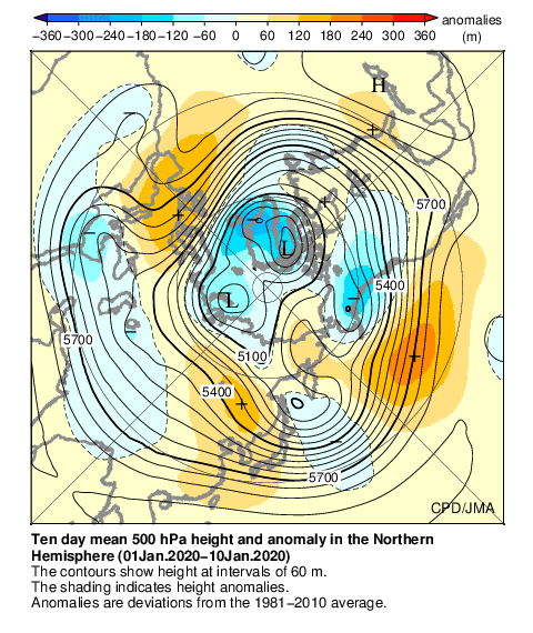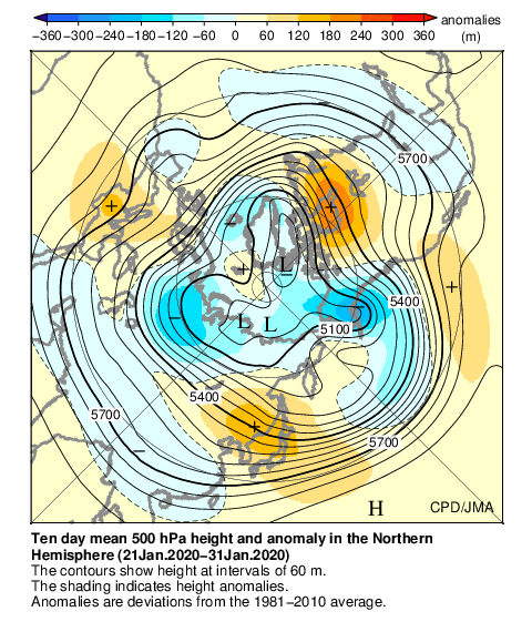 500hPa天気図:北極付近が負偏差、中緯度帯は広く正偏差となり、北極振動が正のパターンで、寒気が北極付近に蓄積し、日本を含む中緯度帯に寒気が流れ込みにくいパターンとなった。また、日本付近を流れる偏西風は北へ蛇行し、全国的に暖かい空気に覆われやすかった。