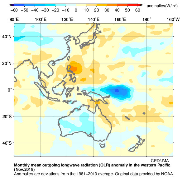 11月: 全国的に天気は数日の周期で変化したが、高気圧に覆われやすく晴れた日が多かった。北・東日本を中心に寒気の南下が弱く、日本海側ではしぐれる日が少なかったが、下旬の前半はこの時期としては強い寒気が南下したため、北日本日本海側を中心に雪が降り積雪となったところがあった。上旬は高気圧に覆われて晴れたところが多かったが、東日本太平洋側は気圧の谷となりやすく、雲が広がりやすかった。9日から10日にかけては低気圧が発達しながら日本海を通過したため、局地的に激しい雨の降ったところがあった。中旬は、低気圧と高気圧が交互に通過し、全国的に天気は数日の周期で変化したが、北・東日本は低気圧や前線の影響を受けにくく、降水量は少なかった。下旬も全国的に天気は数日の周期で変化したが、高気圧に覆われて晴れた日が多かった。