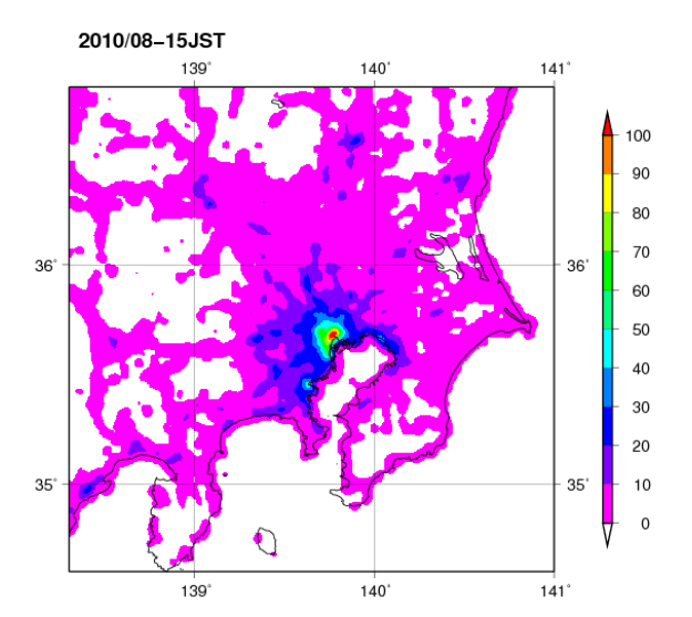 なお、このモデルの都市あり実験における再現精度については概ね良好です。詳細については「ヒートアイランド監視報告(平成23年)」、「同(平成24年)」(気象庁, 2012,2013)を参照してください。