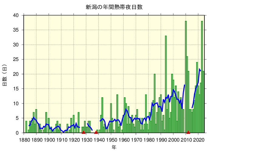 統計期間は各地点の統計開始年から2024年まで。棒グラフ(緑)は毎年の値、折れ線(青)は5年移動平均値、直線(赤)は長期変化傾向(統計期間にわたってデータが均質で、かつ信頼水準90%以上で有意な場合に限る)を示す。なお、観測場所の移転によりその前後でデータが均質でない場合は横軸上に▲で示し、その前後の5年移動平均値は示していない。また、これらの観測場所を移転した地点では、観測場所の移転に伴う影響を除去することが困難なため、長期変化傾向は求めていない。また、気象庁の統計値において、1953~1963年の期間は日界(日別値を求める際に用いる一日の区切り)を9時として日最低気温を観測していた。熱帯夜の年間日数もこの期間は9時日界として算出している。