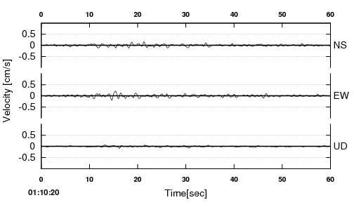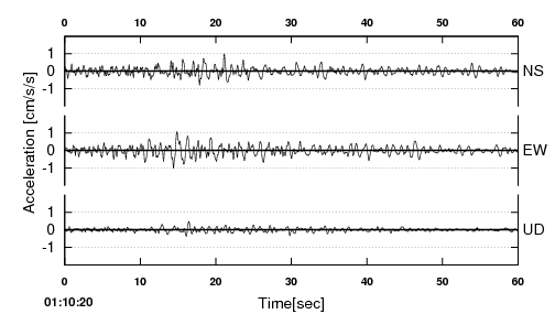【観測地点】 地点名:三田市下深田 地域名:兵庫県南東部 観測時間 2022.01.22 01:10:20〜01:11:20 |
