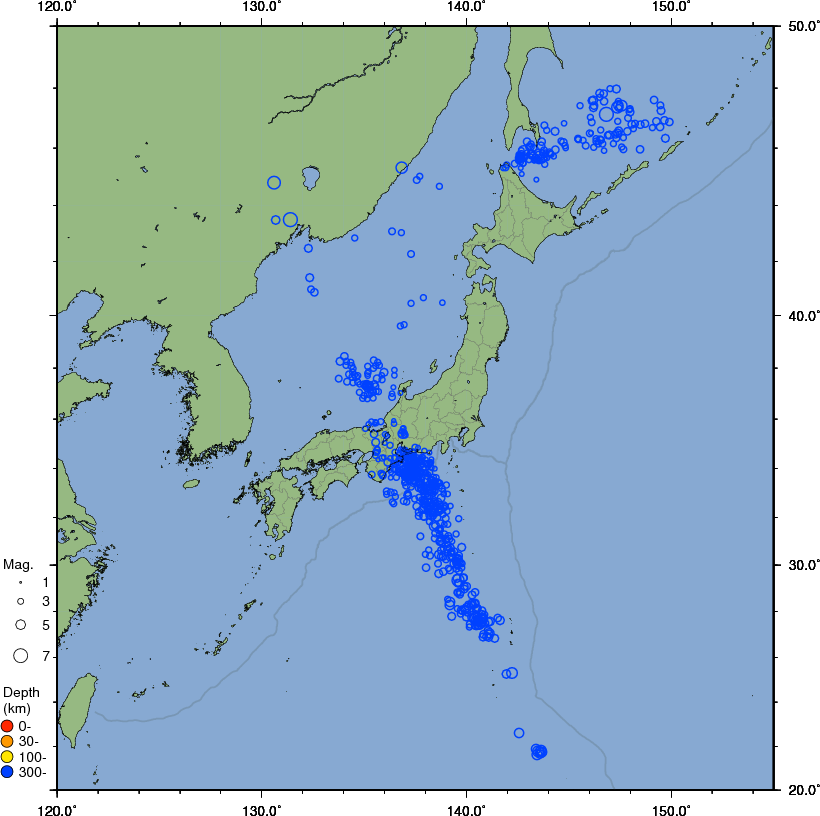 全地震 M>=5 h<30km 30km<=h<100km 100km<=h<300km h>=300km