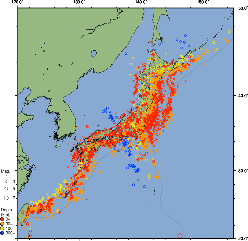 Earthquake epicenters in Japan and adjacent regions (monthly epicenter distribution)
