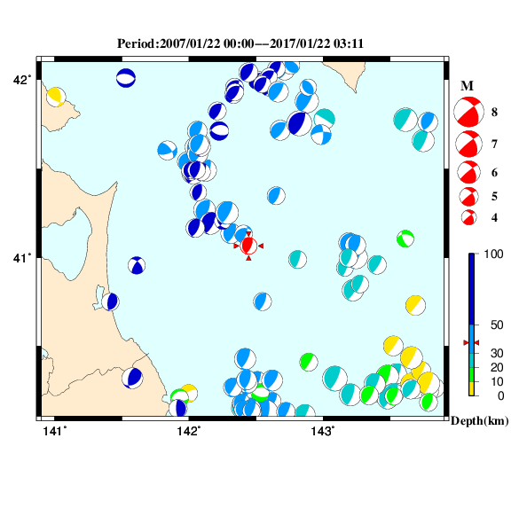 | 2017-01-22 03:11:05.6 | 北緯41度04.0分 | 東経142度26.5分 | 37km | 4.5 |