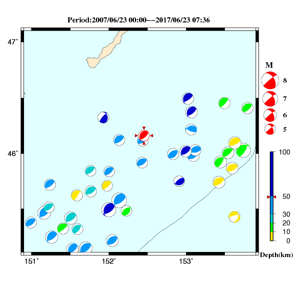 | 2017-06-23 07:36:25.5 | 北緯46度09.6分 | 東経152度27.2分 | 49km | 5.0 |