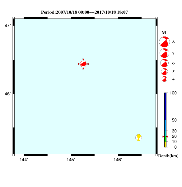 | 2017-10-18 18:07:15.8 | 北緯46度07.4分 | 東経145度16.8分 | 22km | 4.7 |