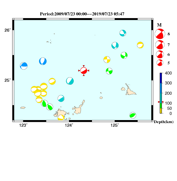 | 2019-07-23 05:47:00.6 | 北緯25度09.6分 | 東経124度18.9分 | 111km | 5.0 |
