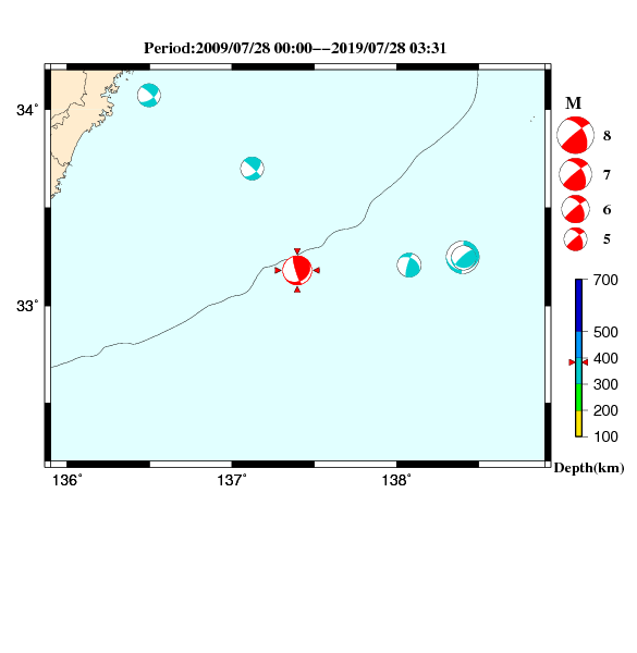 | 2019-07-28 03:31:10.6 | 北緯33度10.8分 | 東経137度23.8分 | 383km | 6.3 |