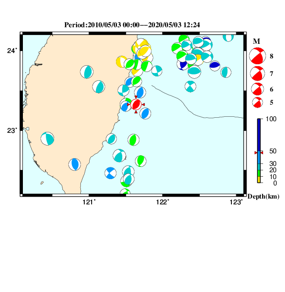 | 2020-05-03 12:24:39.7 | 北緯23度12.7分 | 東経121度38.3分 | 38km | 5.2 |