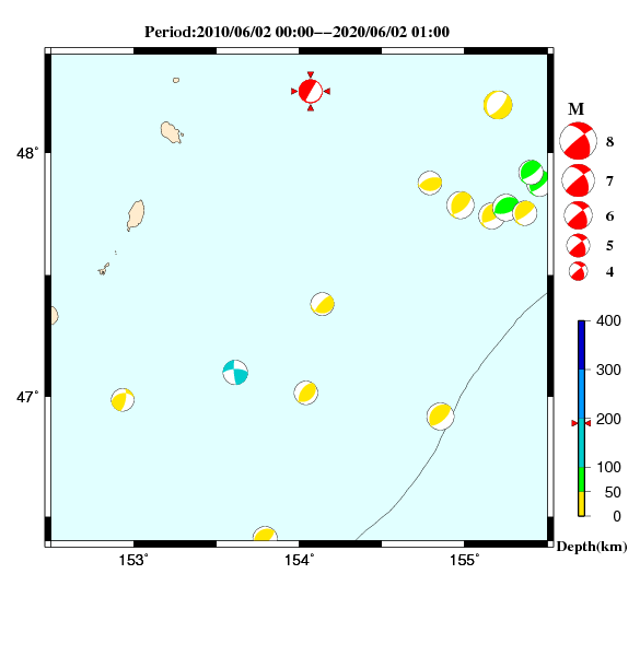 | 2020-06-02 01:00:42.9 | 北緯47度25.4分 | 東経154度01.8分 | 210km | 4.8 |