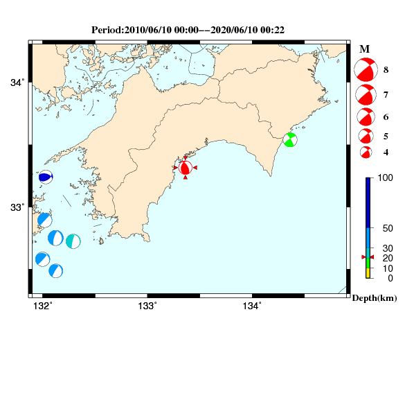 | 2020-06-10 00:22:40.8 | 北緯33度19.0分 | 東経133度21.7分 | 21km | 4.6 |