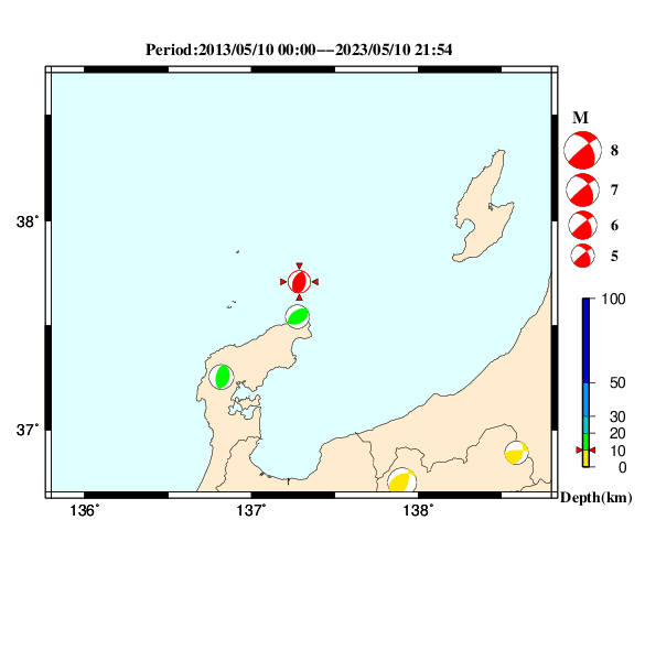 | 2023-05-10 21:54:47.9 | 北緯37度39.1分 | 東経137度17.3分 | 13km | 5.0 |