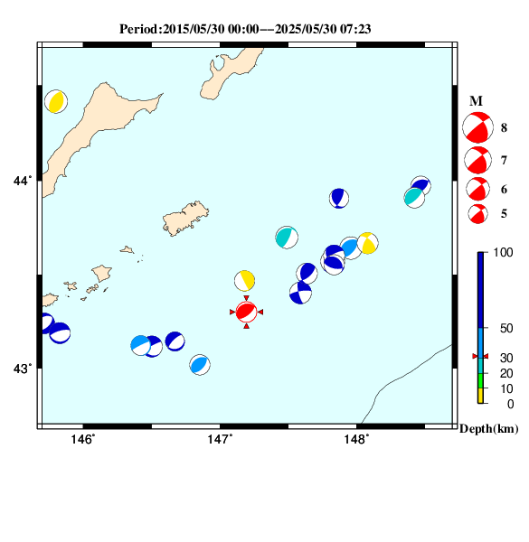 | 2025-05-30 07:23:00.6 | 北緯43度42.8分 | 東経147度11.5分 | 0km | 5.5 |