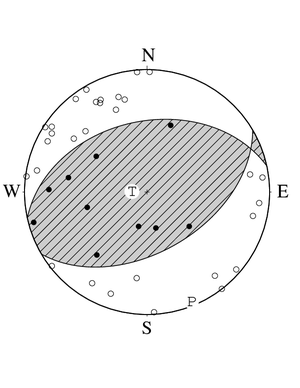 | 走向 | 傾斜 | すべり角 | P軸 | T軸 | N軸 | ||