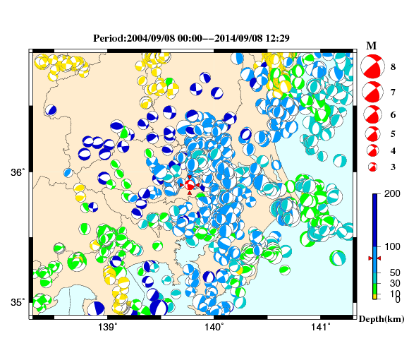 | 2014年09月08日12時29分00.5秒 | 北緯35度53.9分 | 東経139度46.1分 | 78km | 3.2 |