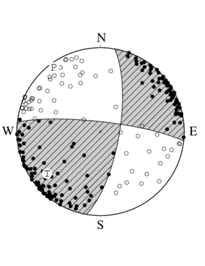 | 走向 | 傾斜 | すべり角 | P軸 | T軸 | N軸 | ||