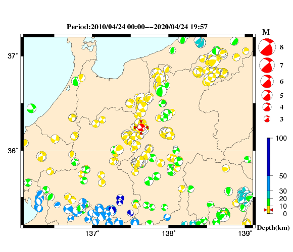 | 2020年04月24日19時57分28.5秒 | 北緯36度14.6分 | 東経137度38.3分 | 5km | 3.4 |
