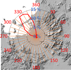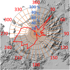 地形の影響で北東~南東と南~西風の出現率は低くなっています。