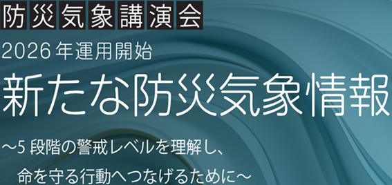 2026年5月から気象庁が発表する防災気象情報が大きく変わります。新たな情報についての理解を深め、適切な活用につなげていただくことを目的に防災気象講演会を開催します。詳細は講演会チラシをご覧ください。5月11日(月)までに申し込みサイトからお申込みください。