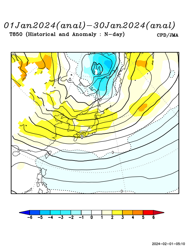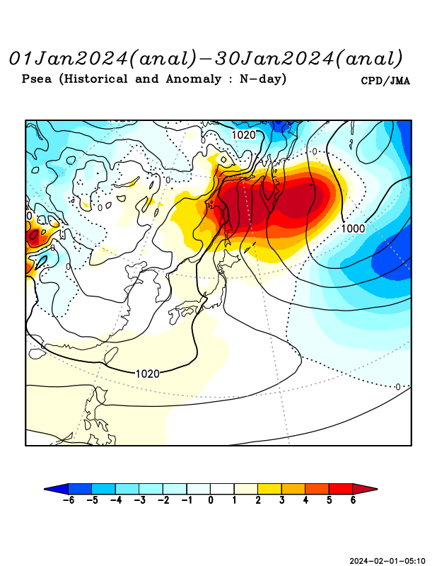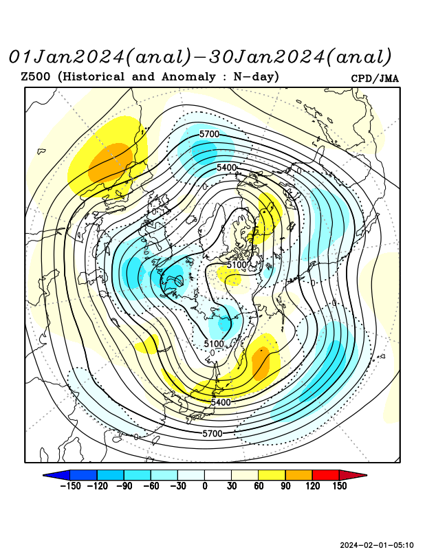 極渦がユーラシア大陸北部に偏在し、その南縁を寒帯前線ジェット気流が流れた。日本付近は寒気の南下が弱かったが、時折、極渦の一部が南下して、寒気の影響も受けた時期もあった。