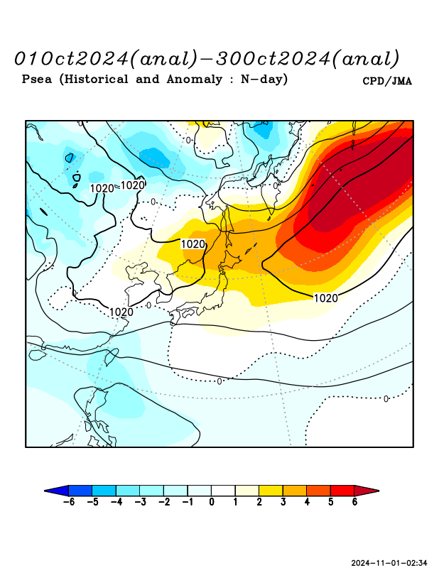 | 2024年10月平均海面気圧・偏差の分布(単位:hPa) | 2024年10月平均外向き長波放射量の偏差の分布(単位:W/m2) |