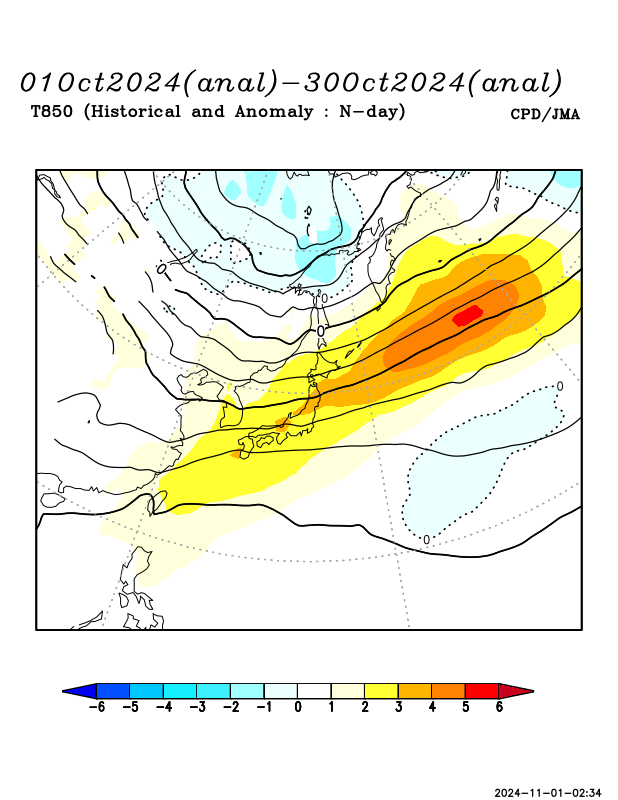 | 2024年10月平均500hPa高度・偏差の分布(単位:m) | 2024年10月平均850hPa気温・偏差の分布(単位:℃) |