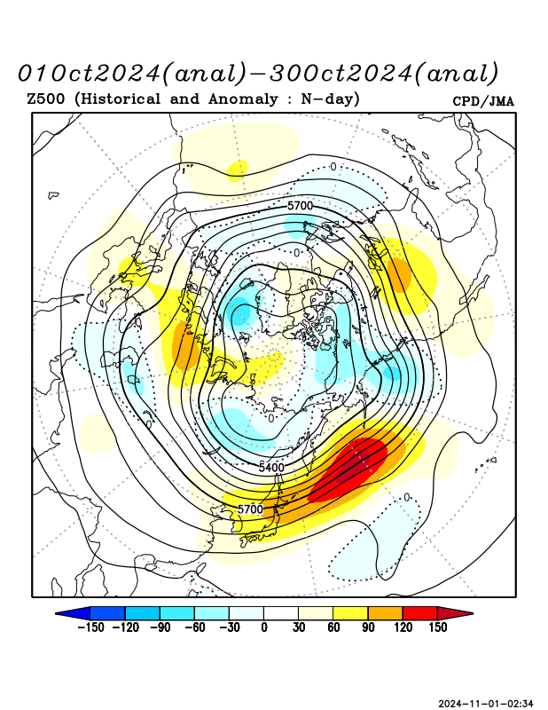 500hPa高度では、日本付近からアリューシャンの南にかけて顕著に高く、偏西風は平年より北に偏って流れやすかった。このため、日本付近は暖かい空気に覆われやすかった。海面気圧では、日本の東で高気圧が強く、日本付近には暖かい空気が流れ込みやすかった。北日本は正偏差で移動性高気圧に覆われやすかった。一方、日本の東の高気圧と華北付近の高気圧の間の東・西日本付近は気圧の谷となり、東・西日本では、低気圧や秋雨前線の影響を受けやすかった。また、東シナ海は負偏差で、沖縄・奄美は台風や湿った空気の影響を受けやすかった。