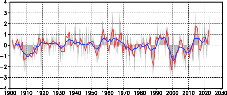 図2:年平均したPDO指数の時系列。赤線が年平均値、青線はその5年移動平均を表す。また、月毎の指数を灰色の棒グラフで示している。