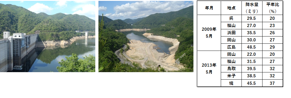 最近10年(2005~2014年)の中国地方の地域平均月降水量平年比では、冬の12月と2月に多雨傾向がある一方で、春に少雨となることが多くなっています。最近10年の5月は5回が少雨となりました。春は農作物等の生育が進み、水利用が増える頃となりますので、少雨の状態が続けば、水不足や、農作物の生育に影響することとなります。2013年5月は降水量がかなり少なく、2013年6月13日の八田原ダムの貯水率は40.6%となり(写真)、取水制限が実施されました。2009年5月と2013年5月の降水量平年比は分布図のように西日本を中心に平年の40%以下の所が多くなりました。中国地方の地域平均平年比は2009年5月は33%、2013年5月は40%とかなり少なく、地域平均の統計のある1946年以降で少ない方からの1位と2位になりました。5月の日別の降水量を見ると(グラフ)、2009年5月はほとんどの日が降水量10ミリ未満となり、2013年5月は多くの日はほとんど雨が降りませんでした。6月の中頃以降にまとまった雨となり、少雨は解消しました。 |