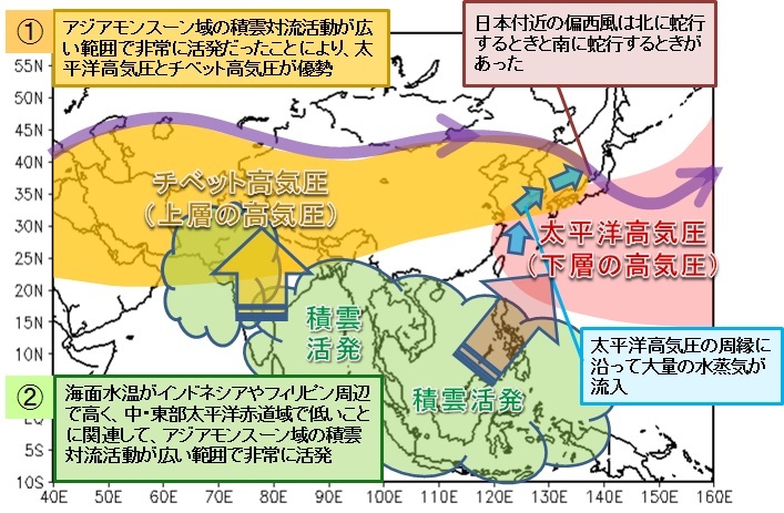 大気の流れの特徴と要因 夏の日本の天候を支配する太平洋高気圧(下層の高気圧)とチベット高気圧(上層の高気圧)は、7~8月はともに平年より強くなりました。特に、太平洋高気圧は西への張り出しの強い状態が続き、沖縄・奄美や西日本では勢力が非常に強くなりました。これらの高気圧の強まりによって、西日本を中心に全国的に高温となりました。また、高気圧に覆われて日射量が平年より多くなったことなどにより、8月の日本近海の海面水温は平年よりかなり高くなりました。 太平洋高気圧とチベット高気圧がともに優勢となった一因は、以下のとおりと考えられます。 ① 海面水温がインドネシアやフィリピン周辺で平年よりかなり高くなりました。 ② 中・東部太平洋赤道域で平年より低くなったことにより、アジアモンスーン域の広い範囲で積雲対流活動が平年と比べて非常に活発になりました。 |