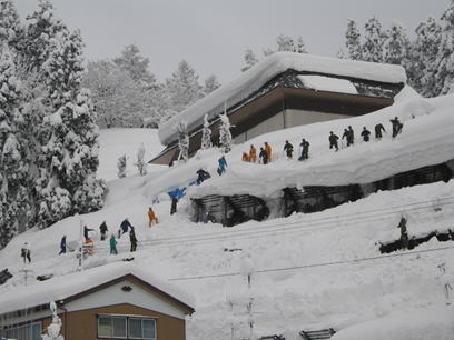新潟県十日町の雪庇(せっぴ)落とし、落雪や雪崩災害を防止するため、人海戦術による雪庇落としが行われた。 2006年1月 新潟県十日町地域振興局提供 |