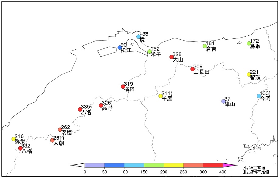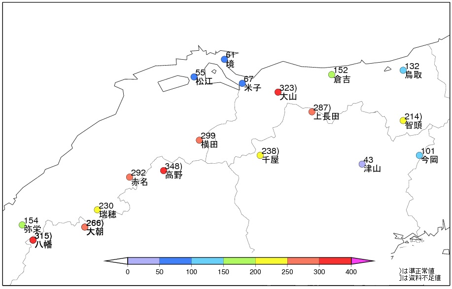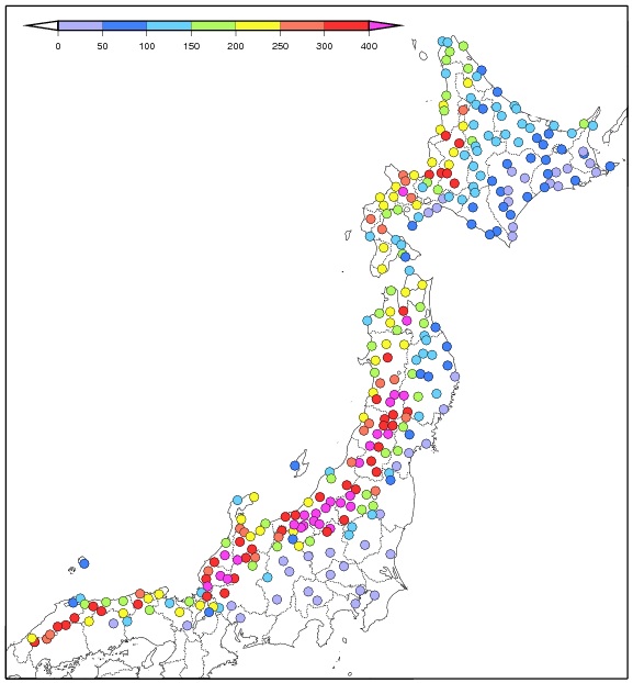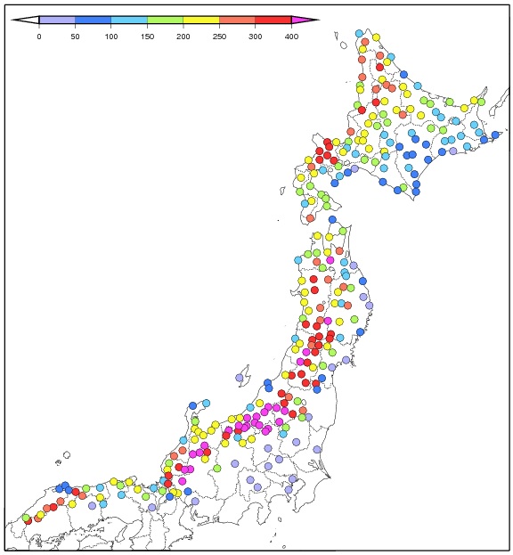 1月の降雪量は日本海側を中心に全国的に多く、中国地方でも中国山地沿いを中心300cmを超える所がありました。 |