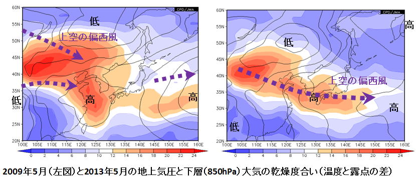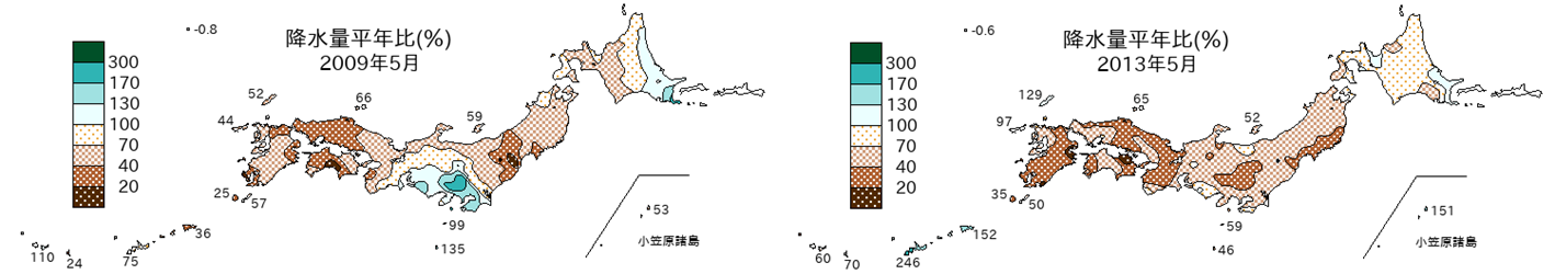 5月の降水量平年比分布図(全国) (左:2009年、右:2013年) |