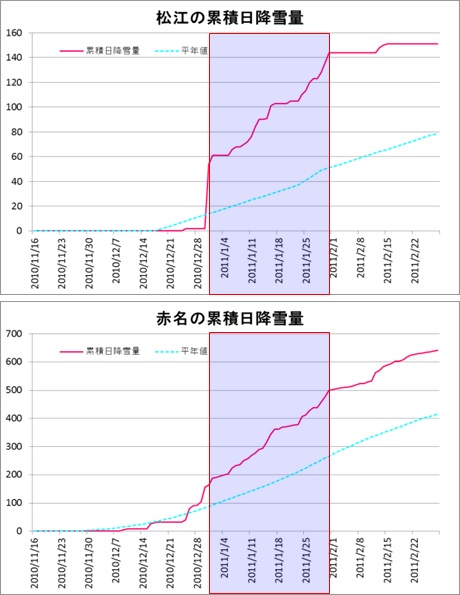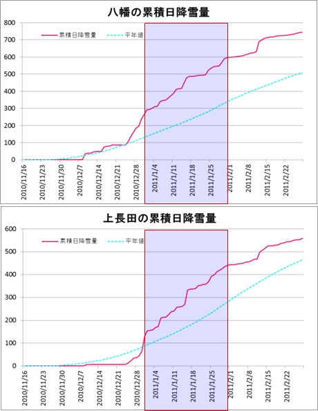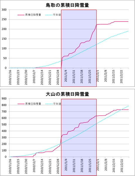 2011年1月は冬型の気圧配置が強まることが多く、降雪量が多くなりました。